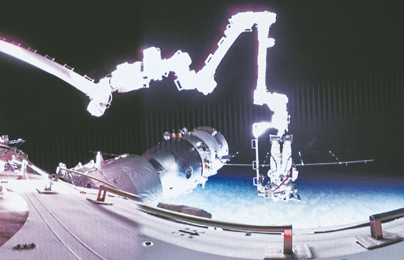 2024年3月2日,神舟十七号航天员乘组第二次出舱活动取得圆满成功,这是我国航天员首次完成在轨航天器舱外设施的维修任务。图为在北京航天飞行控制中心拍摄的神舟十七号航天员江新林在空间站机械臂的辅助下进行舱外作业。